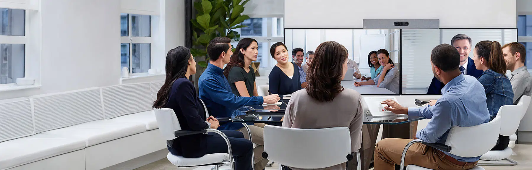 Built for the modern C-suite, the Cisco Room Panorama represents the pinnacle of immersive telepresence. With a focus on design, the Cisco Room Panorama enables you to cut the room in half, add 5,000 miles and retain that authentic, life-like feeling that you are in the same room as your colleagues. The combination of the first-class Cisco conferencing hardware, the collaboration capabilities of the Webex platform and Samsung QLED display, the Room Panorama brings a real wow factor to large meeting spaces and conference rooms.