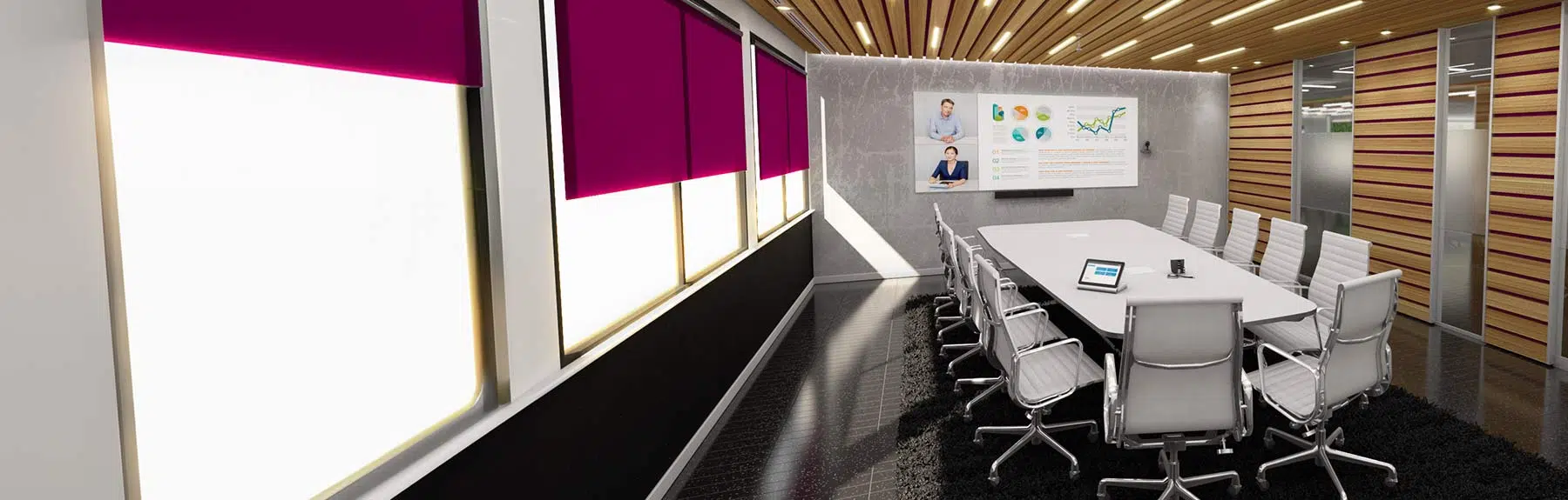 Meeting participants can view content on the meeting room canvas; a front-projected flexible screen from Cyviz, which delivers high quality image reproduction and a 160-degree view angle. Bright, crisp and clear images are displayed on the canvas, courtesy of the Barco F35 projector.
